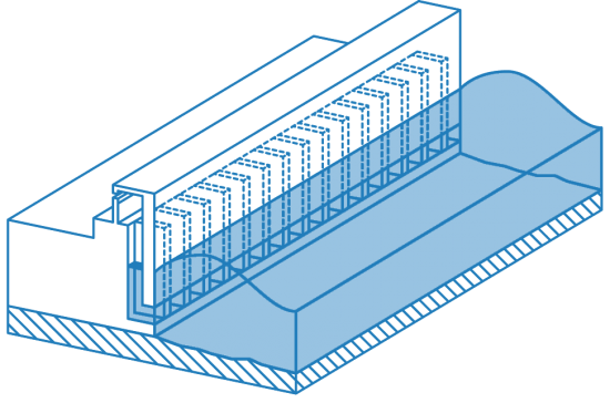 Dikean finkatutako aire-kamera dimentsio hauekin: 4.5 m zabal, 3.1 m luze eta 9.7 m garai, gehieneko itsasbehera bizi ekinozialaren aldean (MLWS).